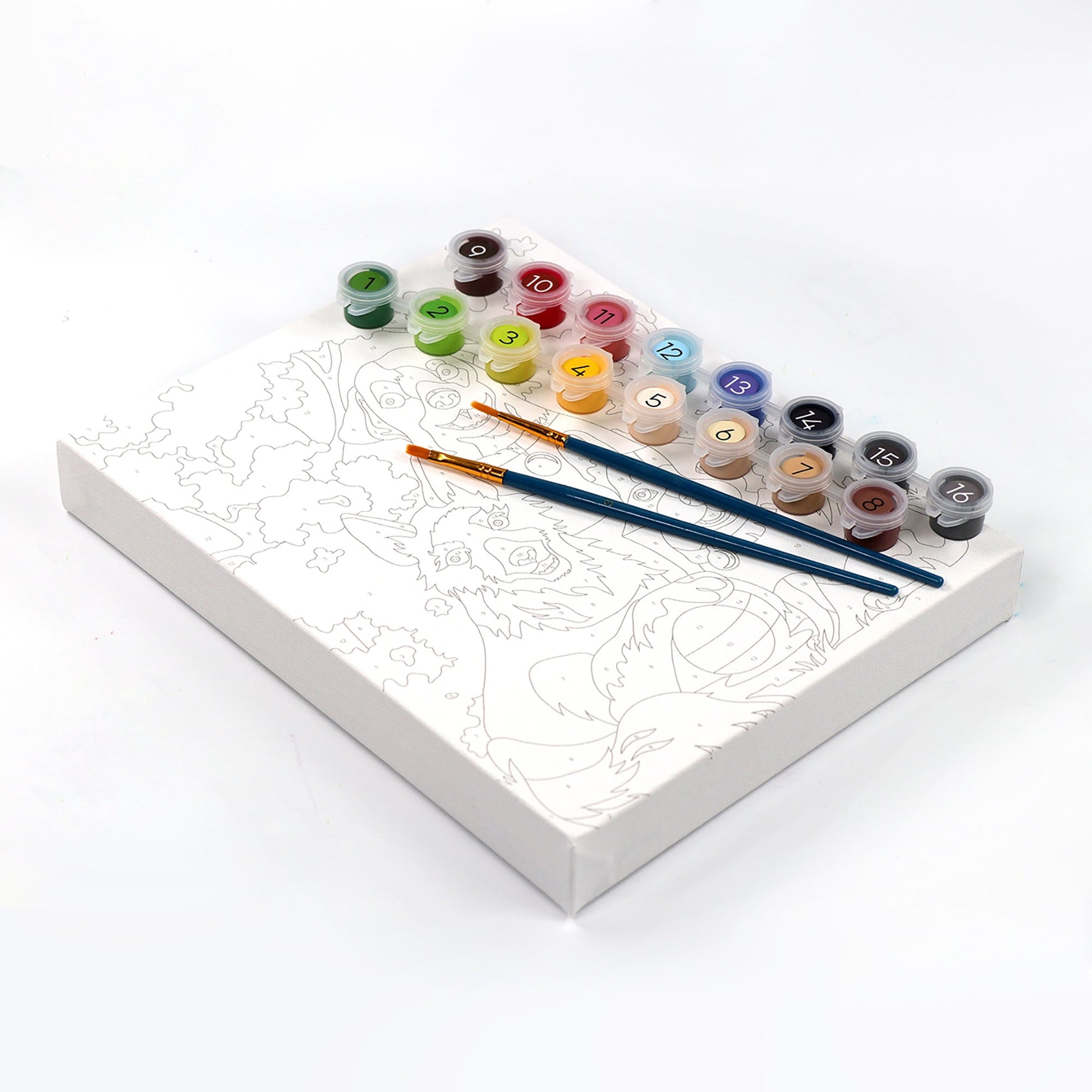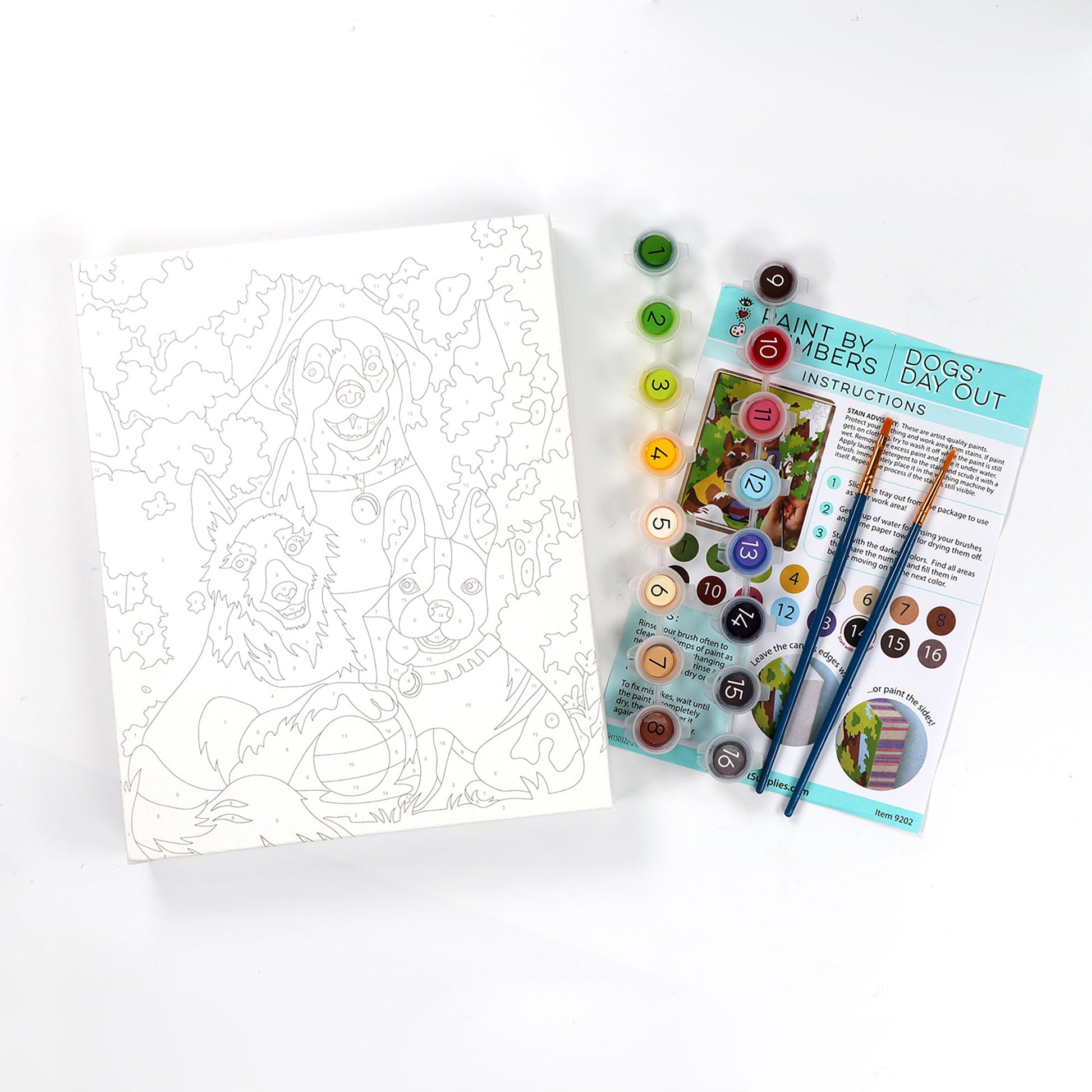 • Classic Paint By Numbers, with a joyful, detailed scene suitable for kids 8 and older. • Bright, friendly artwork features 3 dogs in a park. • Deep 1.25" canvas can hang or stand. • 16 colors of paint and 2 brushes. • Tray pulls out to become your work station. • Package measures 9.5” x 10.5” x 1.4”