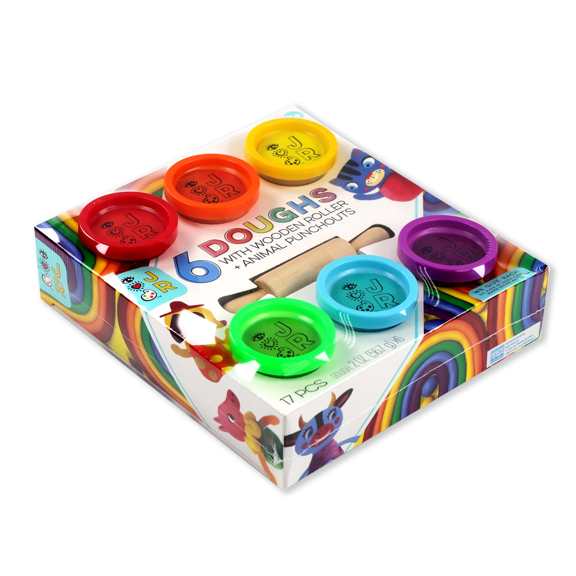 • Roll, shape and create funny animals with this high-quality dough set! • This wonderful and whimsical set is complete with 6 brightly colored soft salt doughs in resealable tubs, a wooden rolling pin and 10 wooden animal shapes. • Press the double-sided wooden punchouts with animal heads and arms into lumps of dough to create instant sculptures! • Roll out dough with the high-quality solid wood rolling pin. • Includes a Caregivers' Guide which shows the benefits of art play and project ideas to spark little ones’ innate creativity.